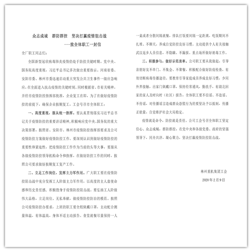 會議根據林州市委、市政府部署,及時推遲公司復工時間,并成立林州重機疫情防控工作領導小組及四個保障小組,全 面動員和落實疫情防控工作。
