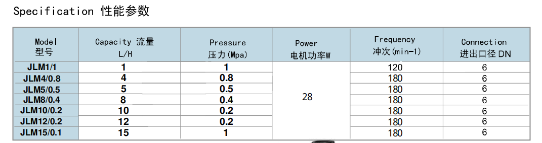 虹興牌JLM型電磁隔膜計量泵,是由電機驅動的機械隔膜式計量泵,適用于底壓力場合的流體計量,有多種材質泵頭可選,膜片統一采用多層復合PTFE材質。因其具有很高的計量精度和穩定性能,而廣泛應用于污水處理,食品劑添加,各種特殊介質的輸送。 計量范圍:0-30L/H 壓力范圍:0-0.5MPa 驅動方式:電機驅動 控制方式:手動、自動控制