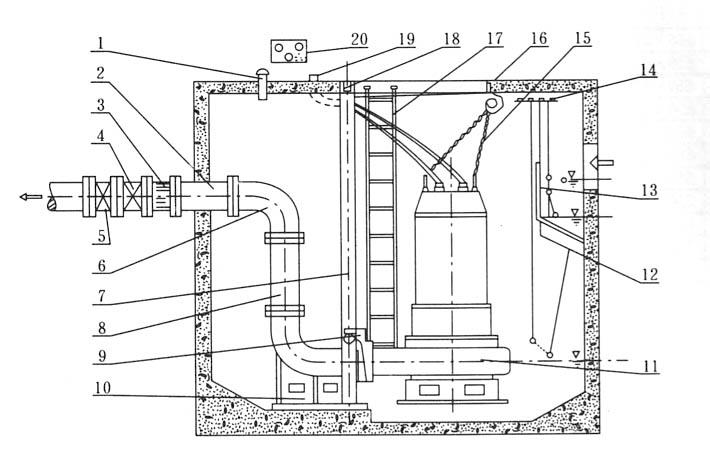 1.通風(fēng)節(jié) 2.預(yù)埋管 3.膨脹節(jié) 4.逆止閥 5.閘閥 6.彎管 7.導(dǎo)軌 8.出水管 9.支架 10.耦合底座 11.自動(dòng)攪勻排污泵 12.浮球開關(guān)(水位開關(guān))13.隔板 14.浮球固定架 15.小鏈 16.掛鉤 17.人梯 18.支撐架 19.電纜出線管 20.電機(jī)保護(hù)器